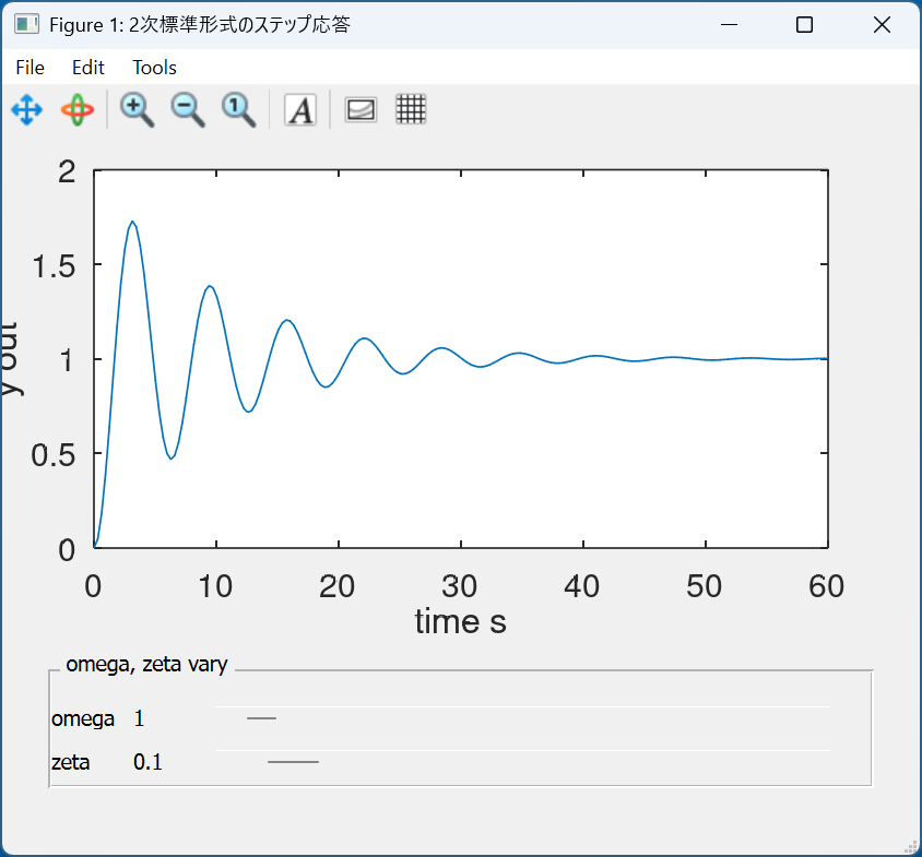 スライダーを動かすと$\zeta,\omega_n$が変化し、それに応じた時間応答を表示します。 観察してください。