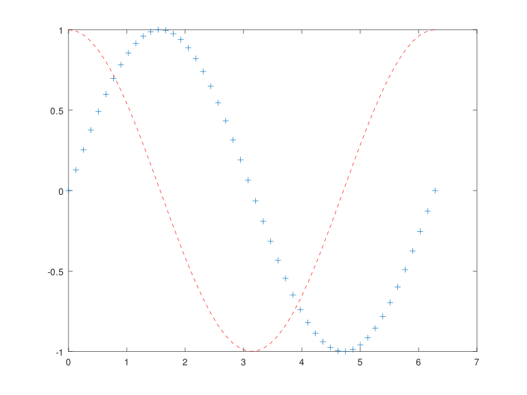 clear all close all clc x=linspace(0,2*pi,50); figure plot(x,sin(x),'+');%データ点を+で表示 hold on plot(x,cos(x),'r--');%データ点を赤色破線で結んで表示 | ![]() |