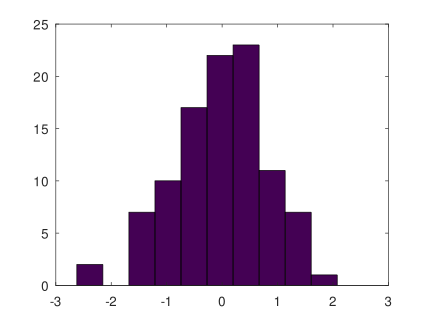7 hist(randn(100,1));%正規分布乱数100個を10区分に分けて度数を示す。