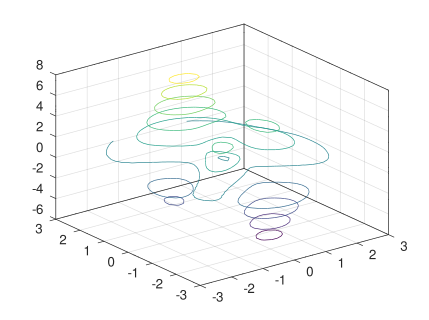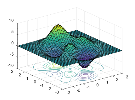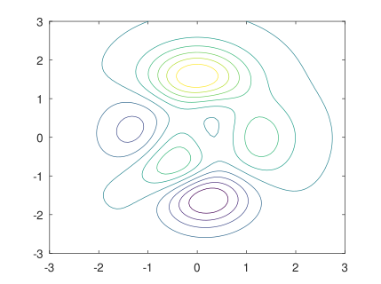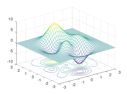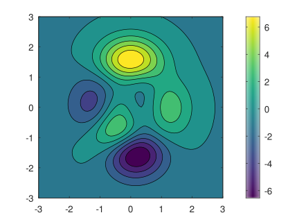 [x, y, z]=peaks(80); figure contourf(x, y, z) ; colorbar; figure contour(x, y, z) ; | contourf![]() | contour![]() |