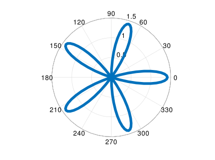 th=linspace(0, 2*pi, 201); figure H=polar(th,sqrt(2)*cos(5*th)); set(H,'linewidth',4); | polar![]() |