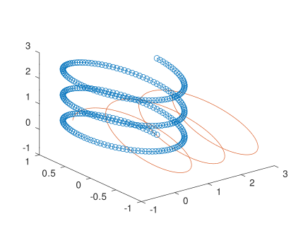 z = [0:0.01:3]; figure plot3 (cos (2*pi*z), sin (2*pi*z), z,'o-'); hold on plot3 (z, exp (2i*pi*z)); | plot3![]() |
