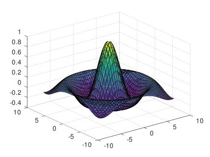 f= @(x,y) sin(sqrt(x.^2+y.^2))./sqrt(x.^2+y.^2); range = linspace (-8, 8, 41); [X, Y] = meshgrid (range, range); Z = f (X, Y); figure surf (X, Y, Z); | surf![]() |