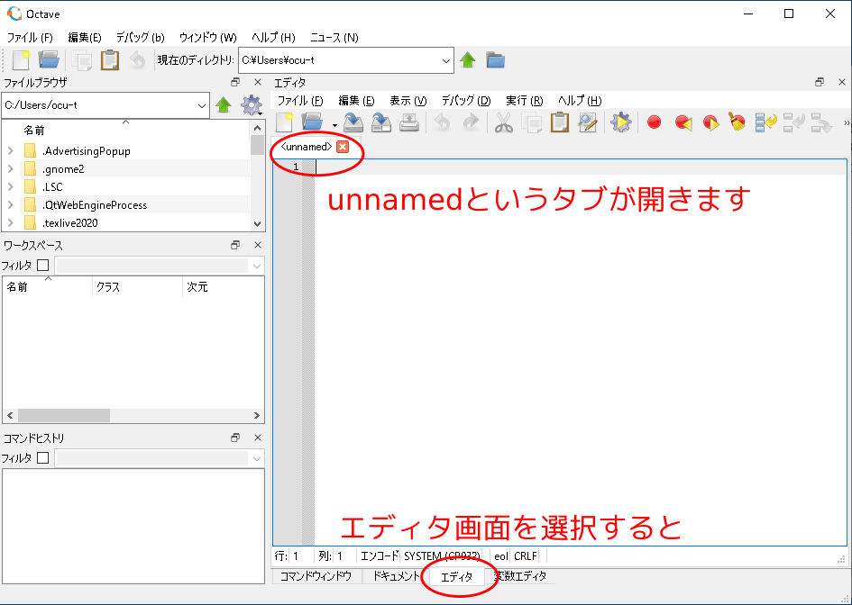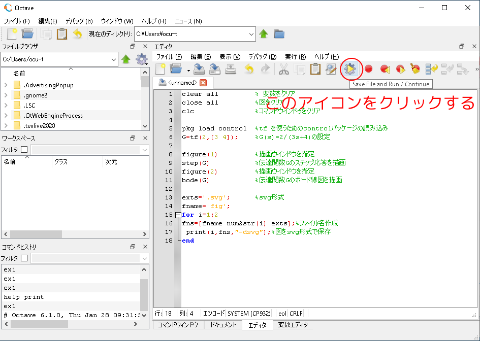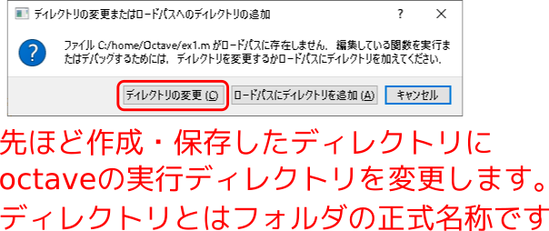 一番左の「ディレクトリの変更」のボタンを押します。実行されると同時に、Octaveの画面が少し変わります。