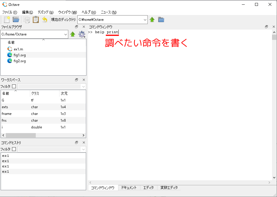 octaveはヘルプも充実しています。 コンソールからhelp (知りたい命令)とすれば、説明が現れます。
