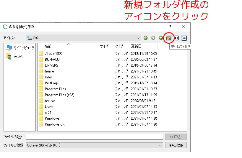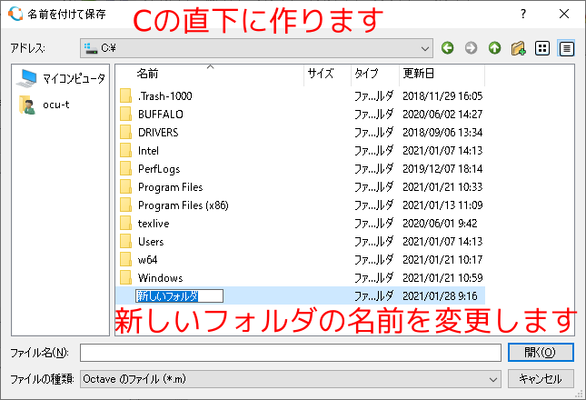 もう一度、新規フォルダ作成をクリックしてOctaveという名前のフォルダを作成しま す。