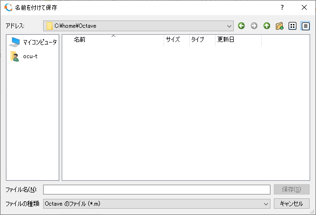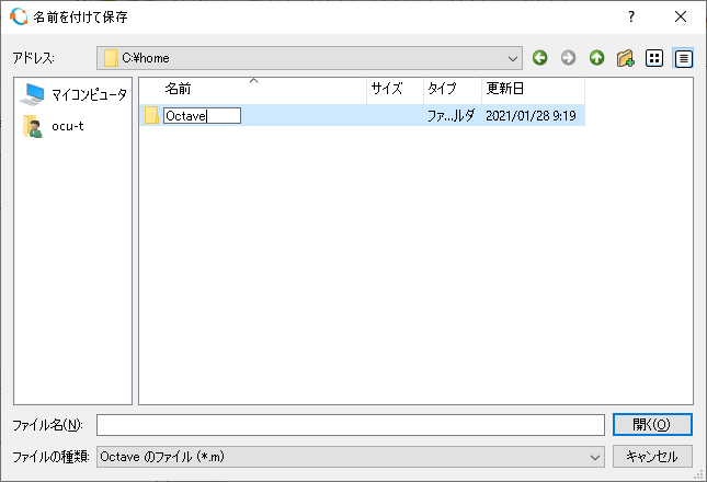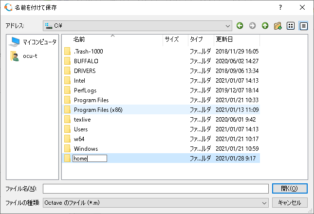 ここでは、C:/home/Octaveに 保存します。(名前は好きな英語名で構いません)