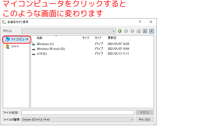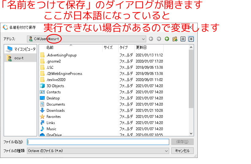 ここで注意してください。 このままでは、C:\Users\ocu-tの下に保存されます。