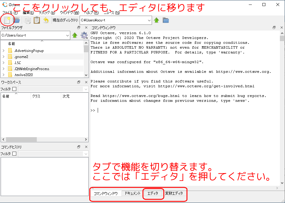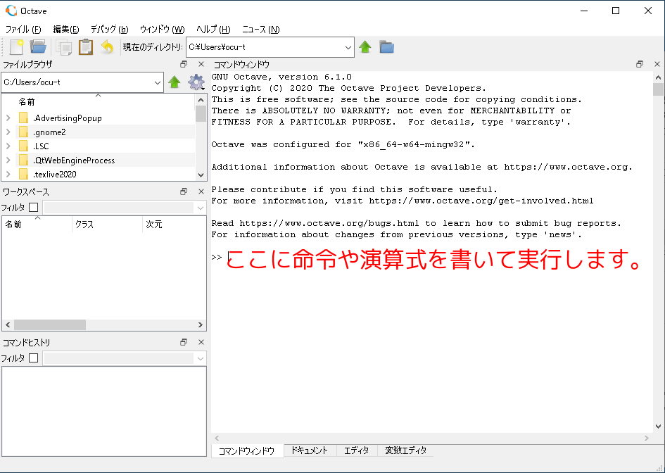 下の方にタブとして「コマンドウィンドウ」「ドキュメント」「エディタ」「実 数エディタ」が表示されています。