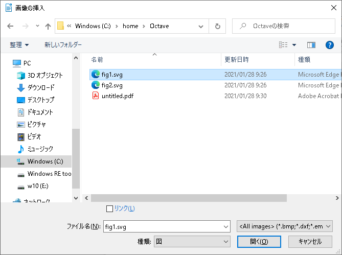 これはOctaveでしか理解できないファイルタイプなので、ベクトル形式 (*.pdf,*.svg)または、ビットマップ形式(*.jpg,*.png)のいずれかを選びましょ う。