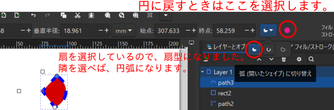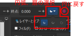 - 円弧、扇型などを描きたいときは、以下の手順とします。