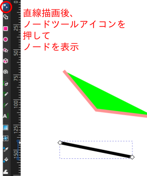 - (1)ノードツールアイコンを押して、編集する図形を選択すると、ノードが表示されます。