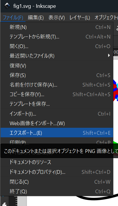 図の形式には、 ベクトル形式以外にビットマップ形式があり、こちらが必要な場合は、 svgで保存後、exportします。