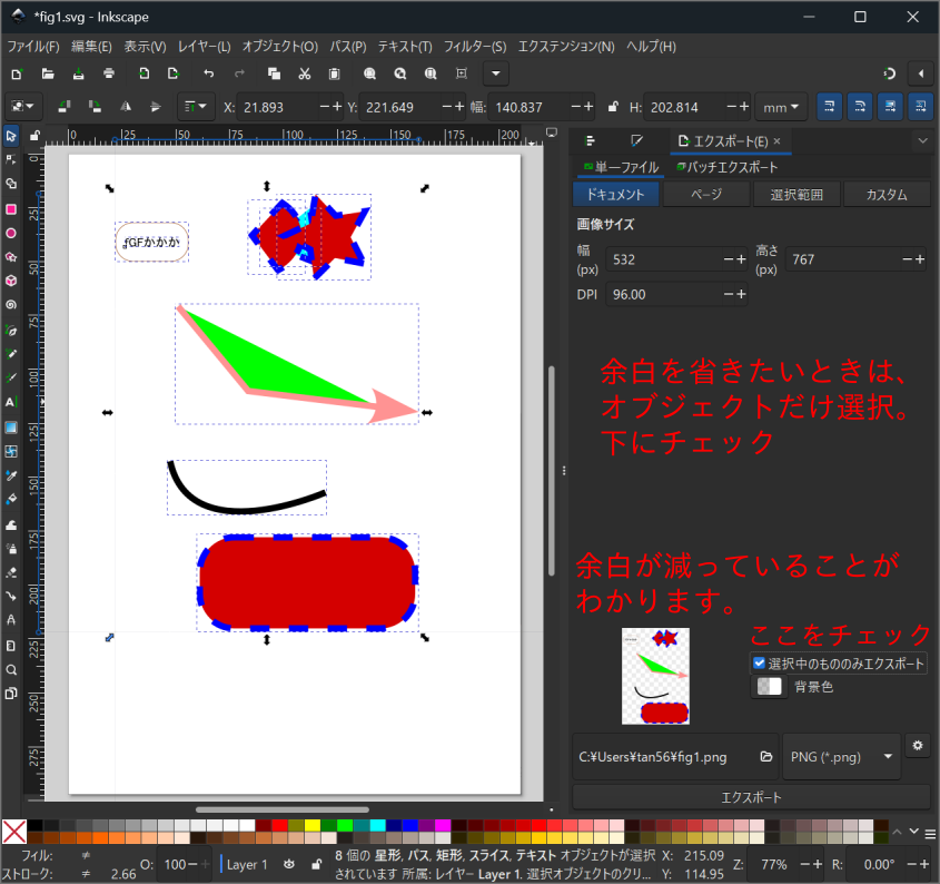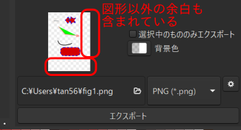 余白を含めたくないときは、「オブジェクトを選択」して、「選択中のもののみエクスポート」にチェックを入れます。
