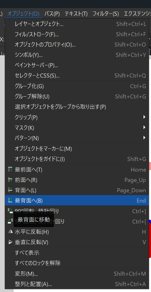 - オブジェクトメニューから、「再背面へ」を選択します。