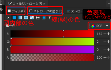 - ストロークの塗りは、線の周囲(縁)の色を指定できます。