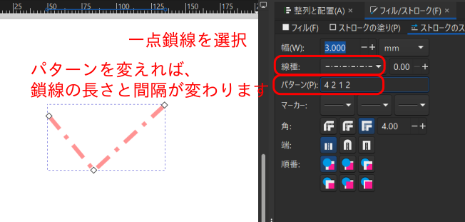 一点鎖線にしました。「パターン4 2 1 2」を変えれば、線の長さと間隔を変更できます。