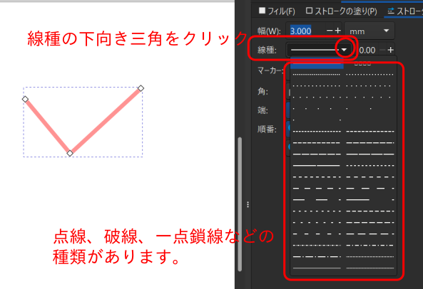 線種の右側の下向き三角印をクリックします。 点線、破線、一点鎖線などに変更できます。