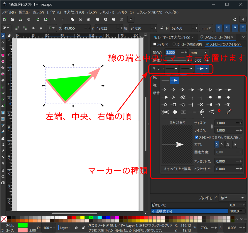 「フィル/ストローク」「ストロークのスタイル」のタブから「マーカー」の メニューを引き出します。 左端、中央、右端の設定ができます。