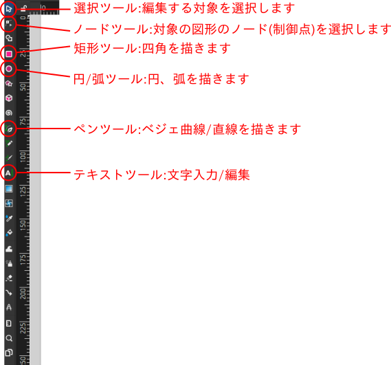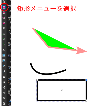 inkscapeで作成する図形は、「図形の周囲(境界),縁」と「図形の内部」に分かれ ています。