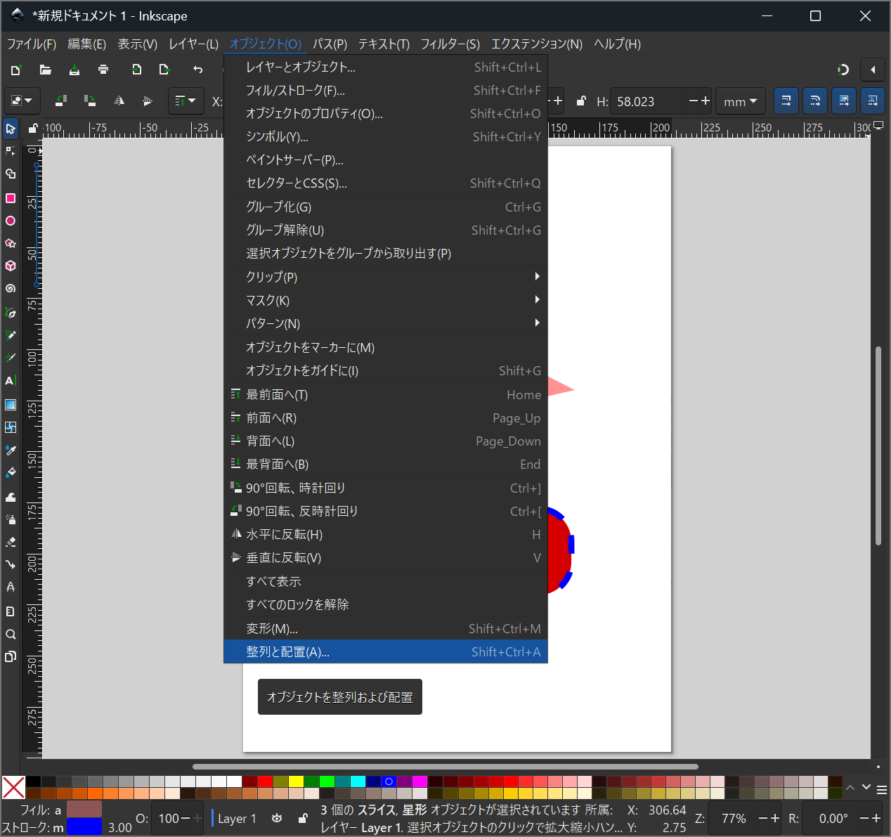- オブジェクトのメニューから、「整列と配置」を選択します。 shift+Ctrl+A