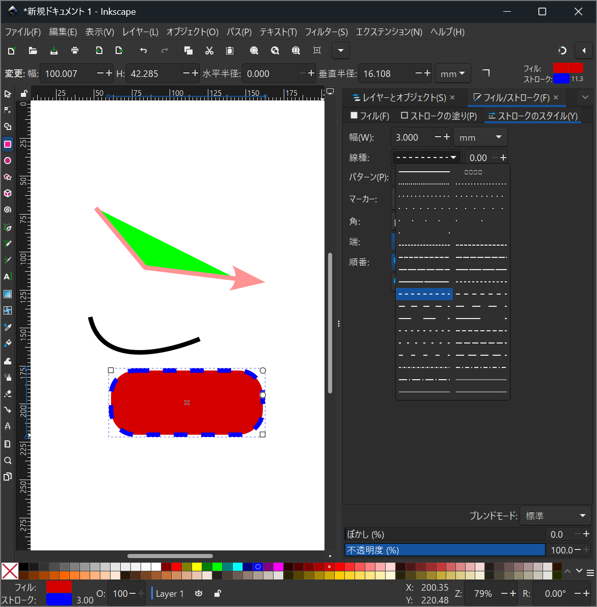 - ストロークのスタイルは、上述の四角を取り囲んでいる、線の幅、線種(実線/点線/一点鎖線など)、 線のマーカー(矢印など)を指定できます。