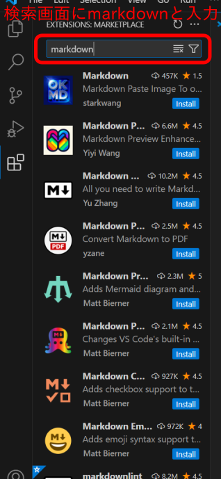 - 検索画面にmarpと入力して、現れた、 Marp for VS Codeをクリックして、インストール