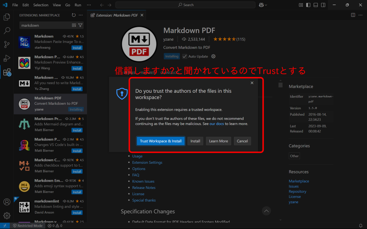 Markup形式で書かれた文書をhtml,pdf,スライド形式に変換するために 以下の拡張機能をインストールします。