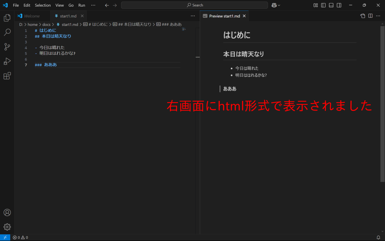 - 画面が分割され、右画面に、htmlの形式で表示されました。