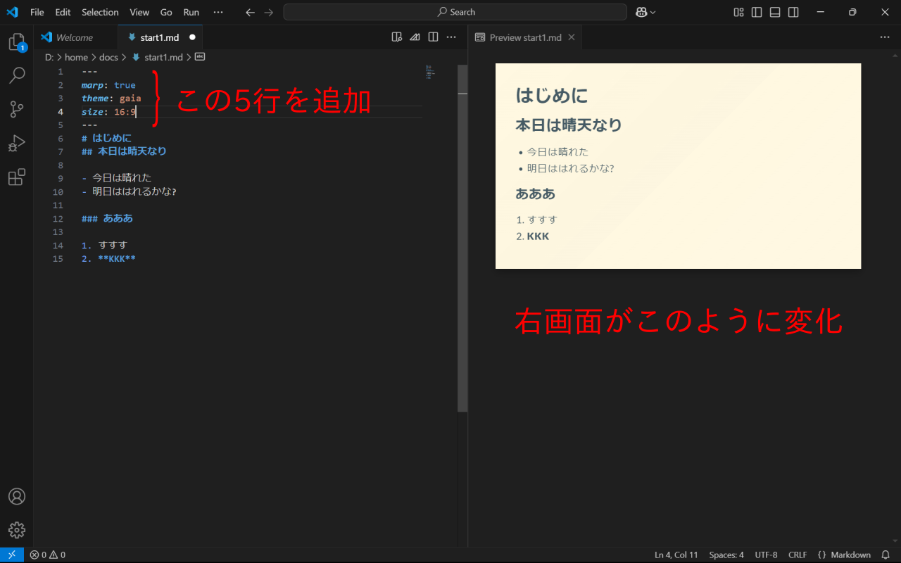 - 文頭(frontmatterといいます)にスライドにするための以下の5行のおまじないを書きます。