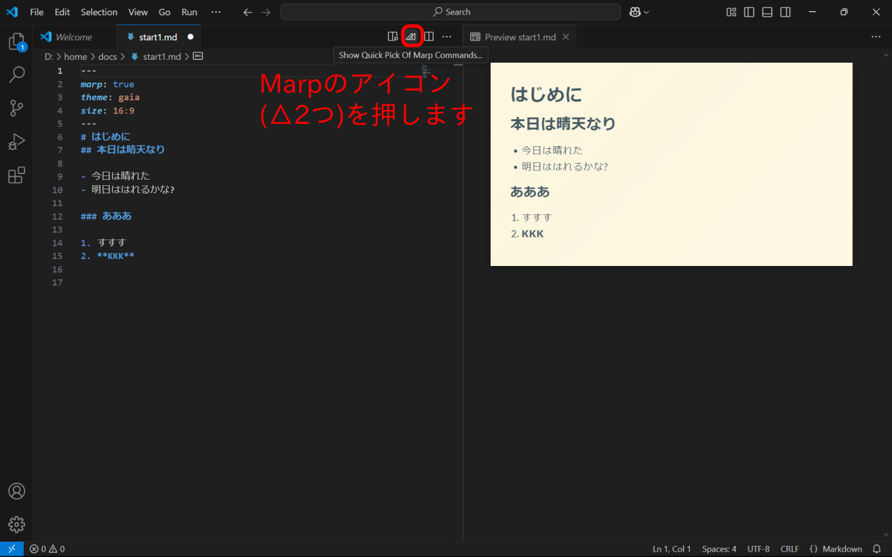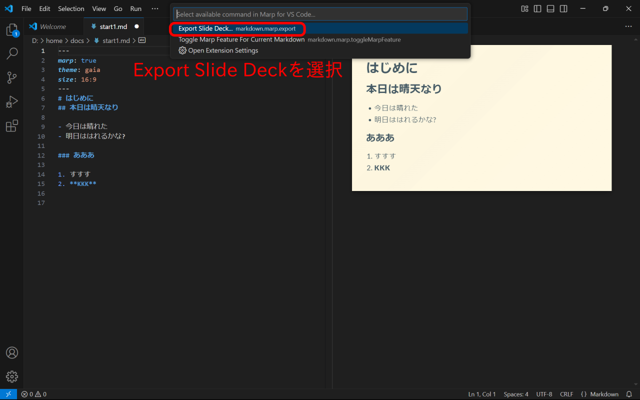 環境変数を有効にすることが必要なので、 marpインストール後再起動していない場合は、再起動してください。