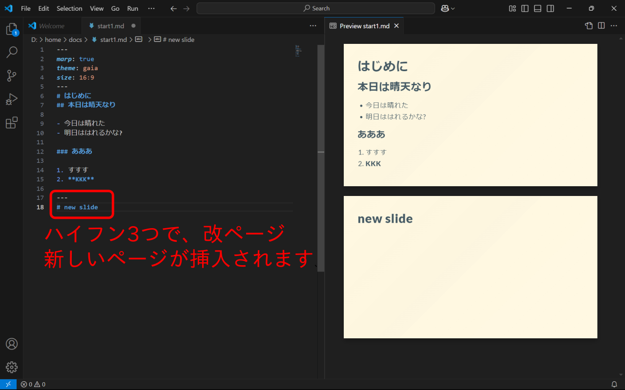 - 新しいスライドに書くときは、ハイフン3つで区切ります。